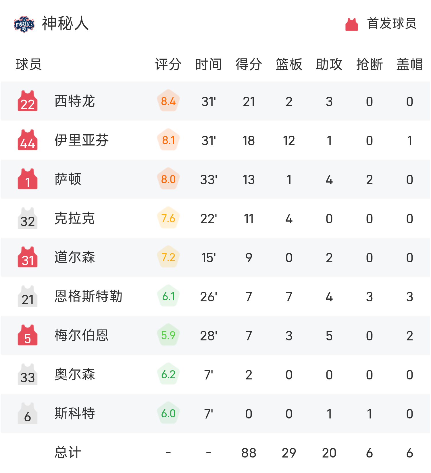 WNBA战报:西特龙21分,波士顿20分9板,神秘人88-84险胜狂热