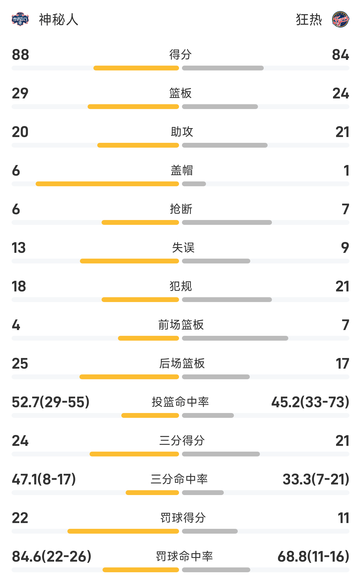 08月16日讯 25赛季WNBA 常规赛,狂热对阵神秘人。双方全场战罢,狂热84-88不敌神秘人。西特龙砍下全场最高的21分2板3助,率领神秘人成功取胜。